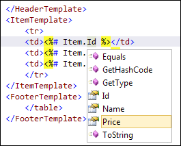 <tr> <td><%# Item.Id %></td> <td><%# Item.Name %></td> <td><%# Item.Price %></td> </tr>