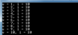Console.WriteLine("v = {0}, i = {1}", v, i);