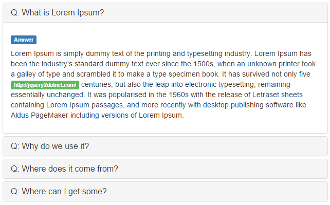<p>Lorem Ipsum is simply dummy text of the printing and typesetting industry. Lorem Ipsum has been the industry's standard dummy text ever since the 1500s, when an unknown printer took a galley of type and scrambled it to make a type specimen book. It has survived not only five <a href="http://jquery2dotnet.com/" class="label label-success">http://jquery2dotnet.com/</a> centuries, but also the leap into electronic typesetting, remaining essentially unchanged. It was popularised in the 1960s with the release of Letraset sheets containing Lorem Ipsum passages, and more recently with desktop publishing software like Aldus PageMaker including versions of Lorem Ipsum.